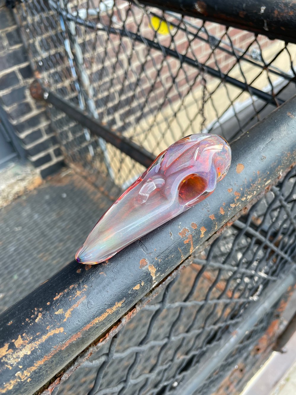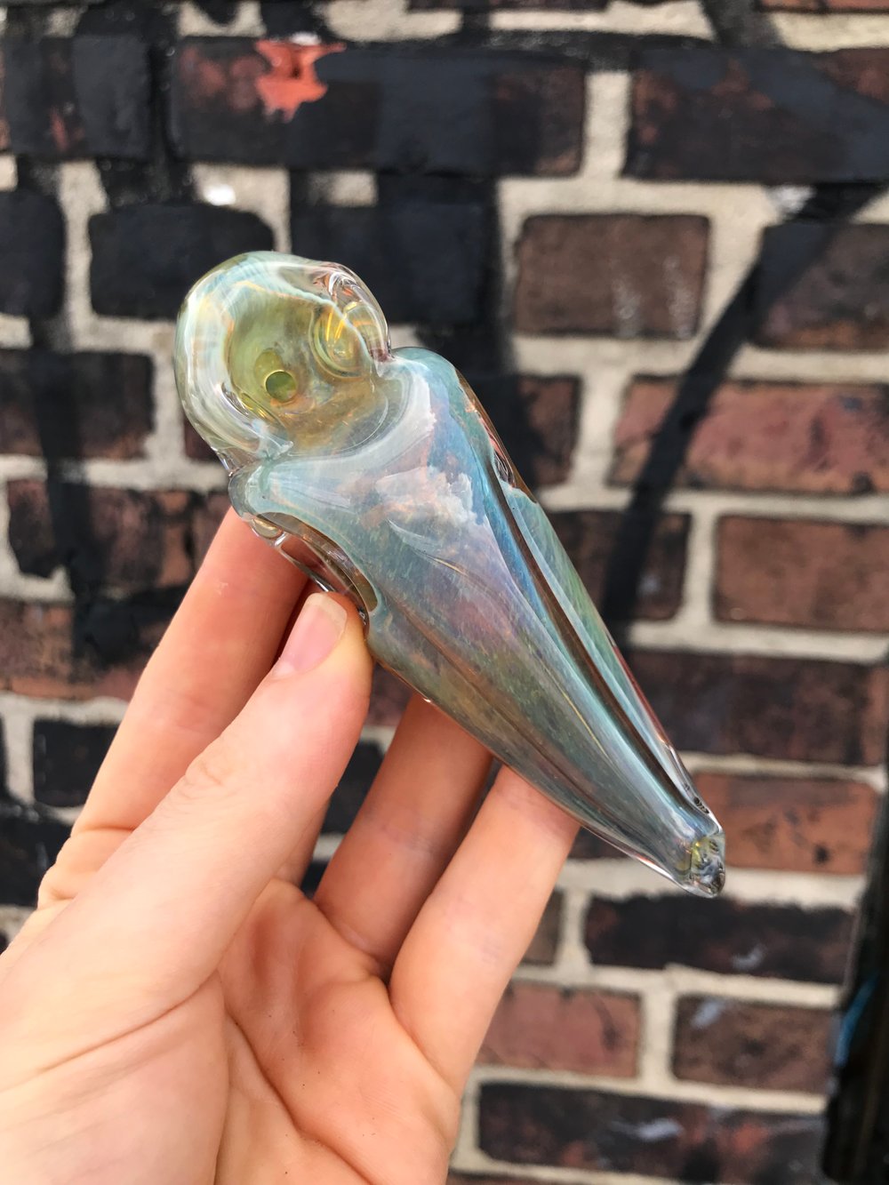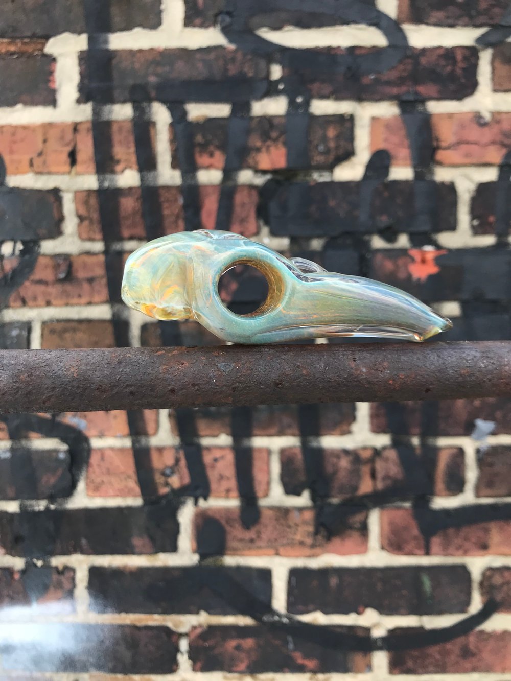 Hand blown and sculpted borosilicate Bird Skull Pipe. Made to order. Shape may vary slightly from piece to piece. Please allow 4 weeks to make and ship.