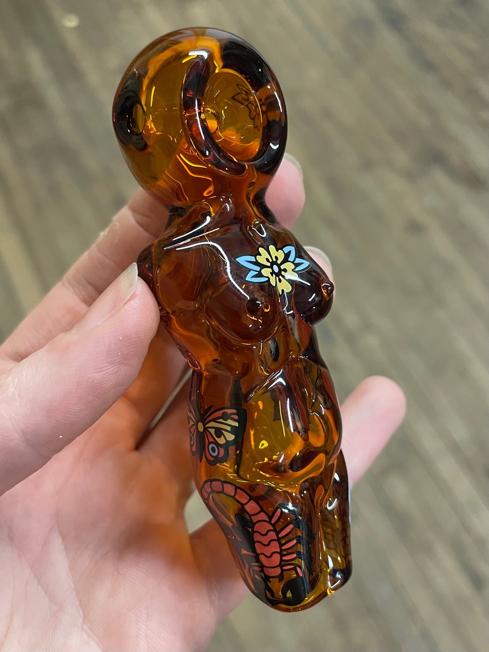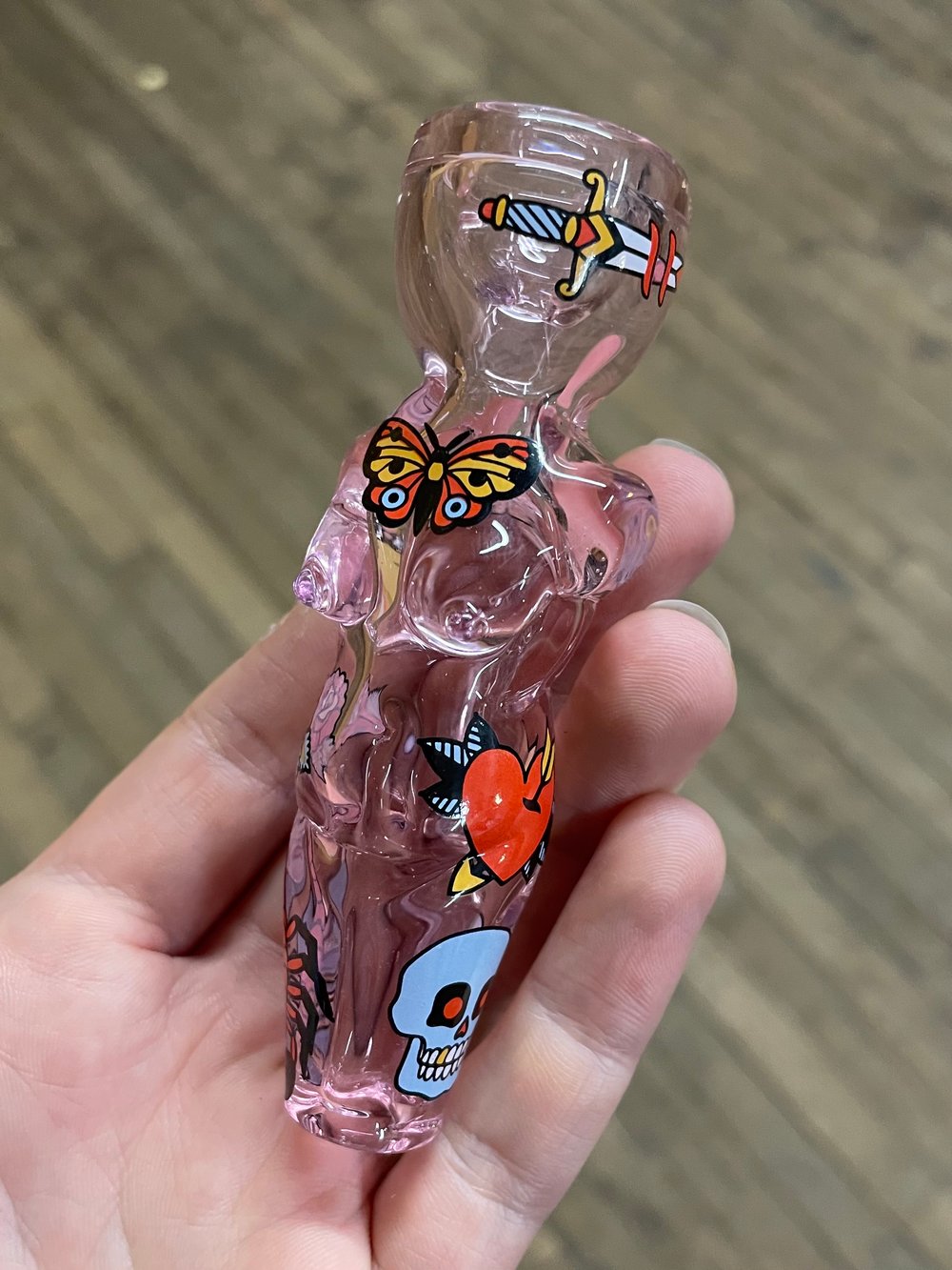 Hand blown and sculpted borosilicate body pipes with tattoo decals designed by myself. Made to Order. Ships within 5 weeks. Shape and decal placement varies.
